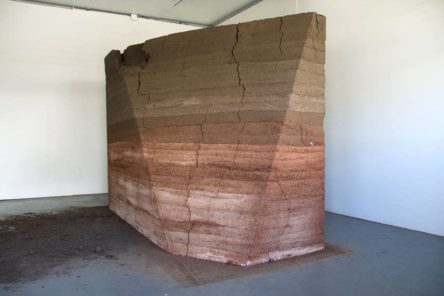 Over time A Small Area of Land erodes into partial ruin. The second half of the sculpture title Kaka‘ako Earth Room is an acknowledgement to Earth Room, an installation of Walter de Maria. However, while Kaka‘ako Earth Room is positioned after De Maria, the sculpture is subject to a explore the process of critical regional reappropriation. Since the surface of dirt is easily anticipated by viewers in Hawai‘i since earth is seen everyday, the construction of A Small Area of Land is offset from the wall by distances for walking and gathering at either side of the gallery. This decision builds from an aspect of De Maria’s Earth Room that involves the interiorization of a material as crucial as soil. Kaka‘ako Earth Room takes interiorized earth and crafts it into an object. Initially it was thought of as an indoor landform furniture. Then the driving factor of the project arrived. The horizontal slab of dirt is turned up to stand with an agency of its own and reveal its posture and bands of variation.